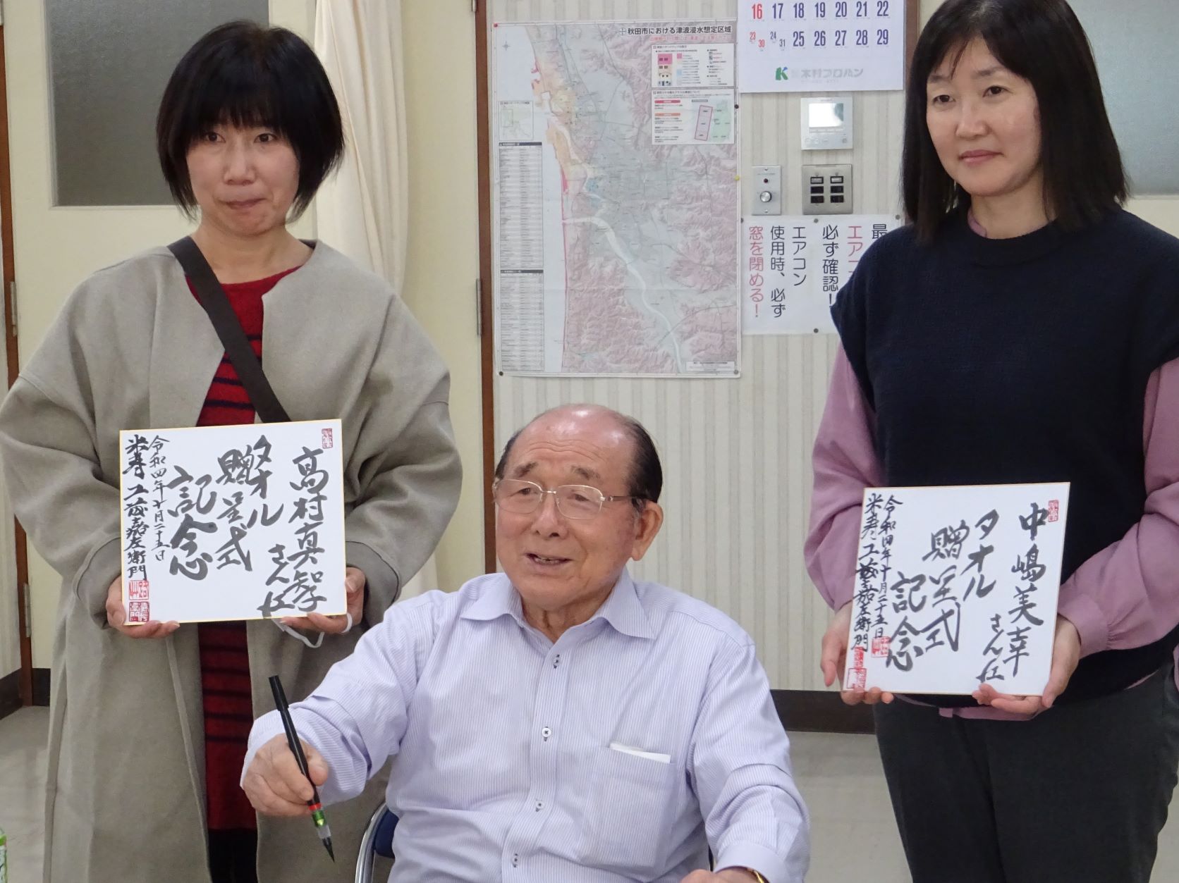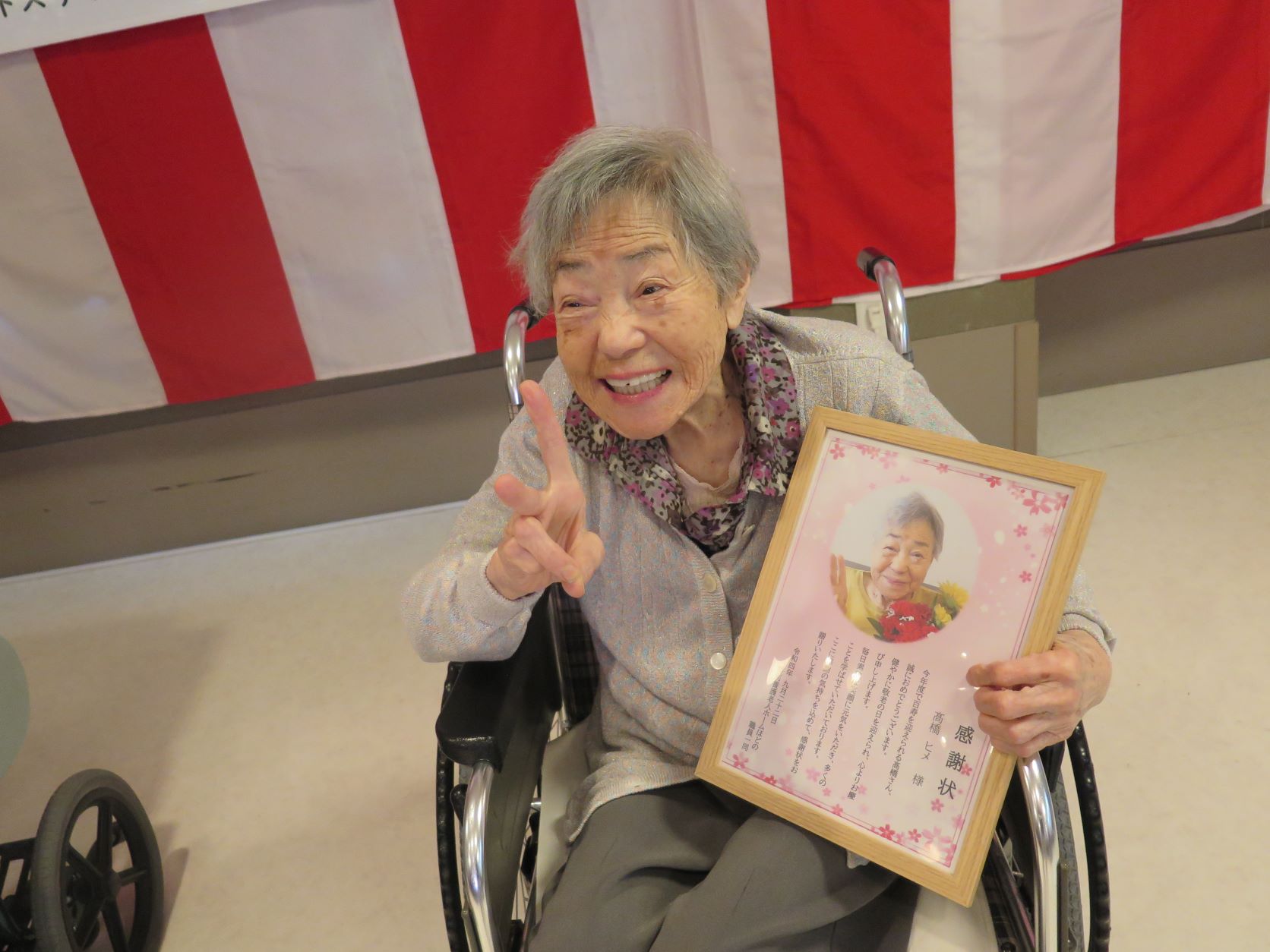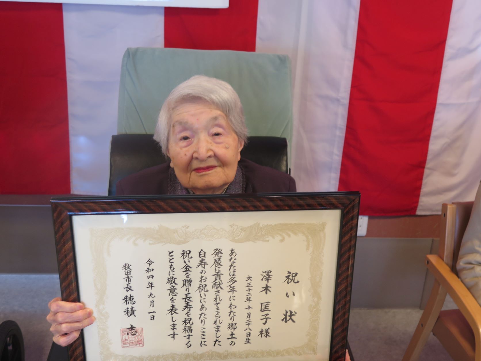 今回の受賞者は米寿2名、白寿4名、百寿2名となり、各階の受賞者代表挨拶を、2階は百寿高橋ヒメ様、3階は澤木匡子様が務めました。お二人とも、しっかりとした口調で挨拶文を読み上げていました。
