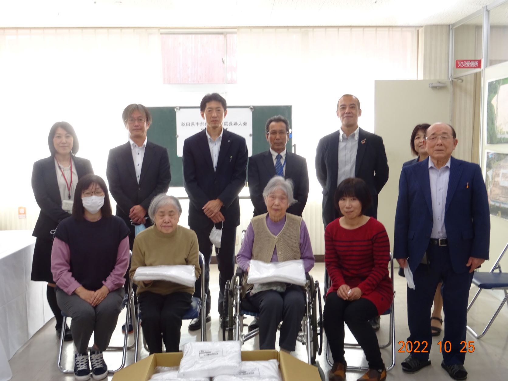 10月25日、秋田県中部地区郵便局長婦人会様よりタオルを寄贈して頂けるとのことで、局長婦人会様より4名の方が来苑されました。寄贈の際には、ご利用者を代表して2名の方に出席してもらい、和やかな雰囲気の中で執り行われました。