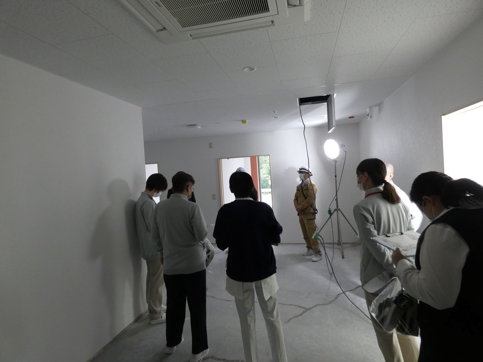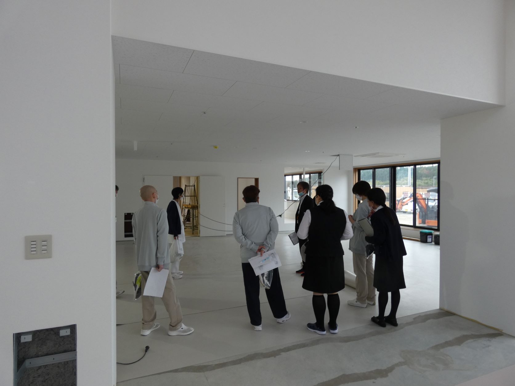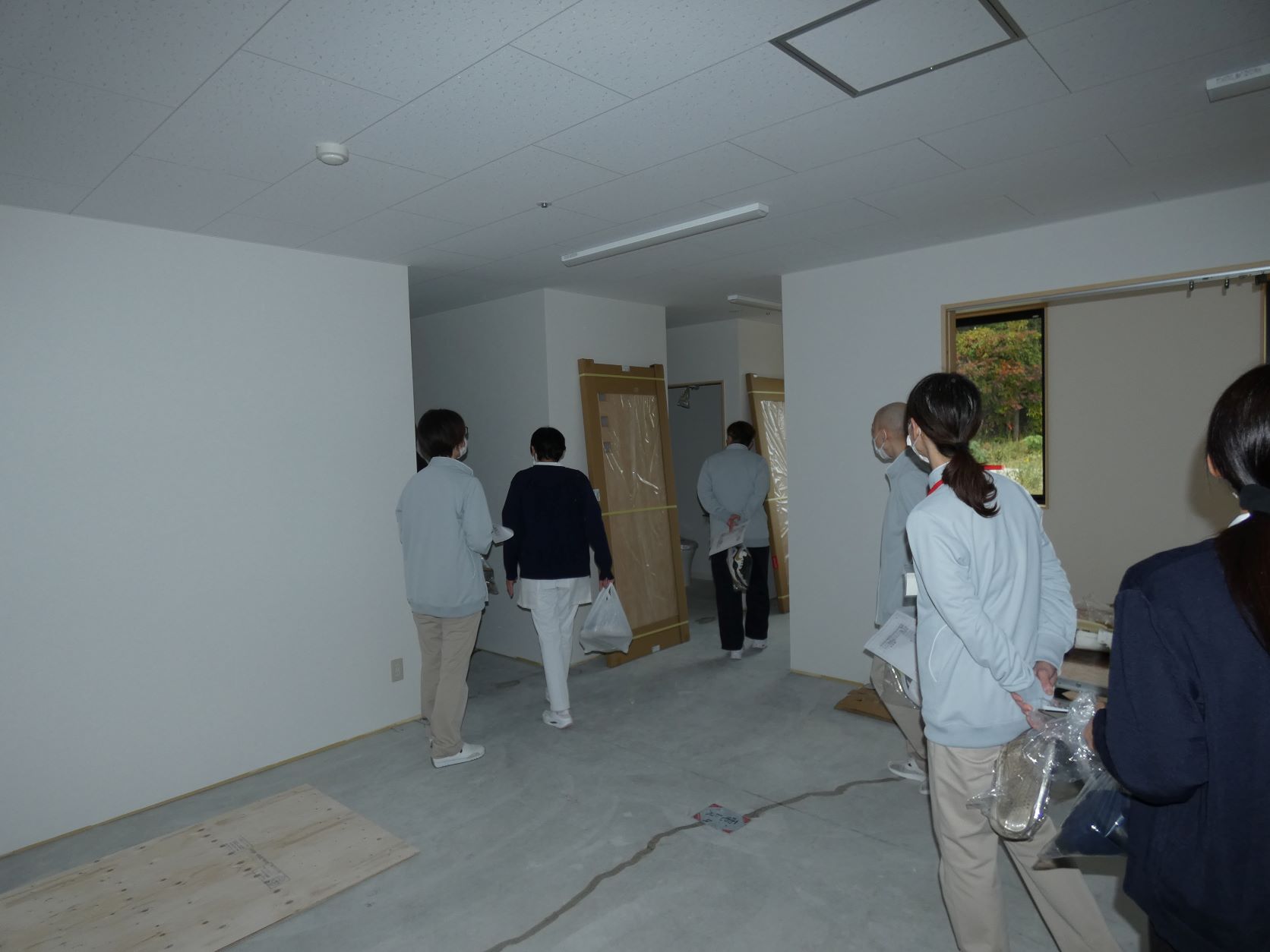 各居室の広さや動線の確認、今後搬入が予定されている設備について説明がなされ、現在の施設と比較しての介助方法や、新施設に移ってからの業務の流れを思い描くことができました。