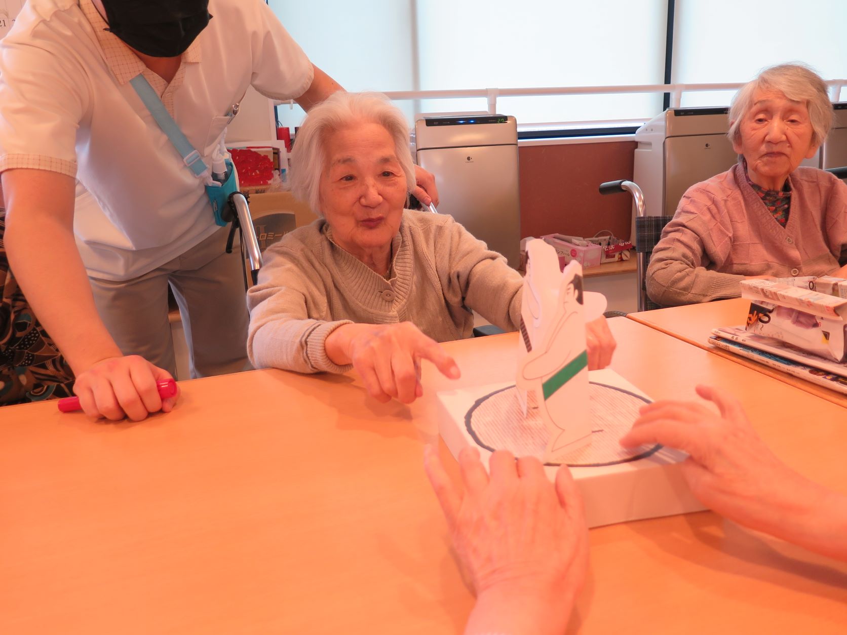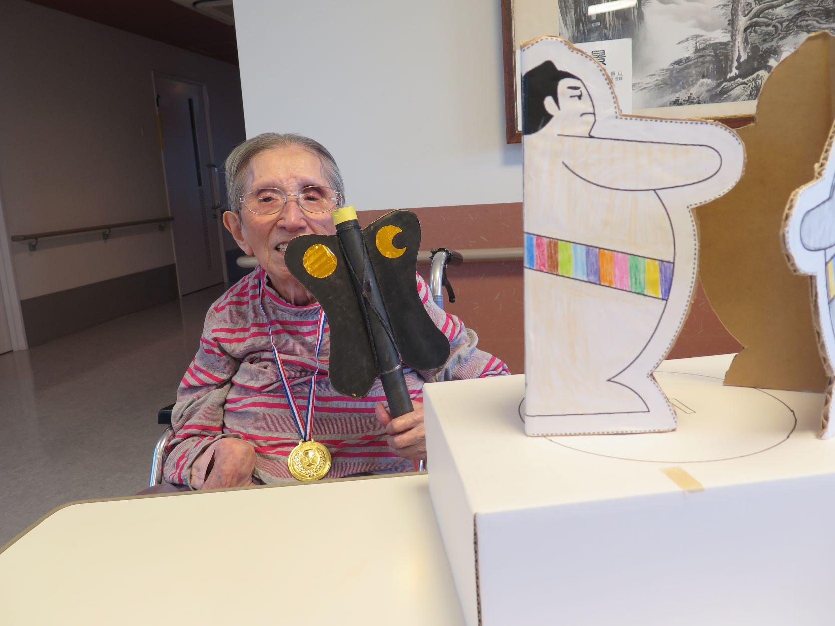 そして、待ちに待った紙相撲大会ではトーナメント戦で行い、見事に優勝されたご利用者にはメダルの贈呈を行いました。優勝された方も惜しくも敗れてしまった方も「また、やりたい!」との言葉もあり、賑やかな雰囲気の中で紙相撲大会を終えることが出来ました。