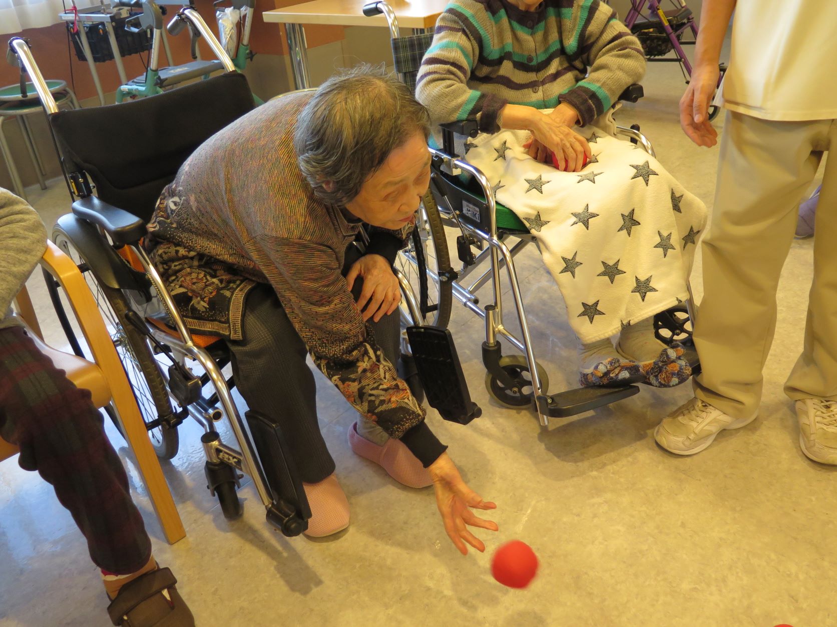 片手で持って転がせばいいので、椅子に座っても、車椅子に乗っても出来るのが特徴です。初めての試みなのでとりあえずやってみることに。鉄球は用意できなかった為、「玉入れ」の玉で代用です。