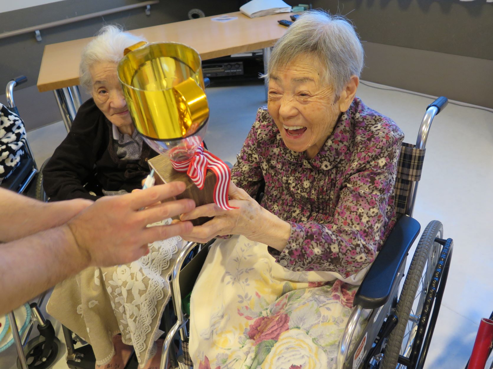 今年は節目の長寿である喜寿の方1名、白寿の方2名、百寿の方2名に感謝状と記念品を贈呈いたしました。利用者代表の挨拶には涙ぐむご利用者もいて、非常に感動的な式典となりました。今年も式典を行う事ができ、職員一同大変嬉しく思います。これからも健やかに過ごして頂けますように、精一杯お手伝いさせて頂きます。