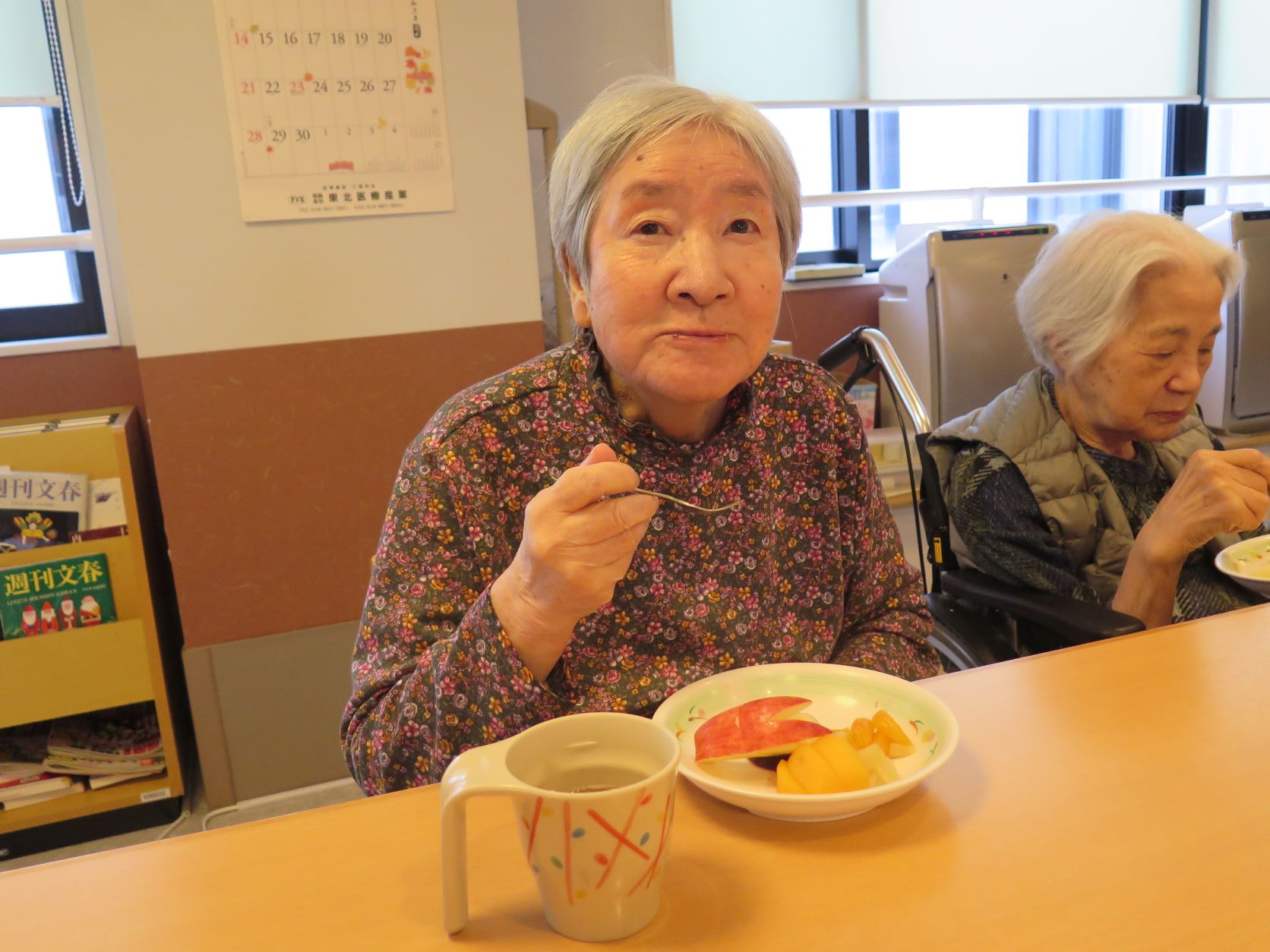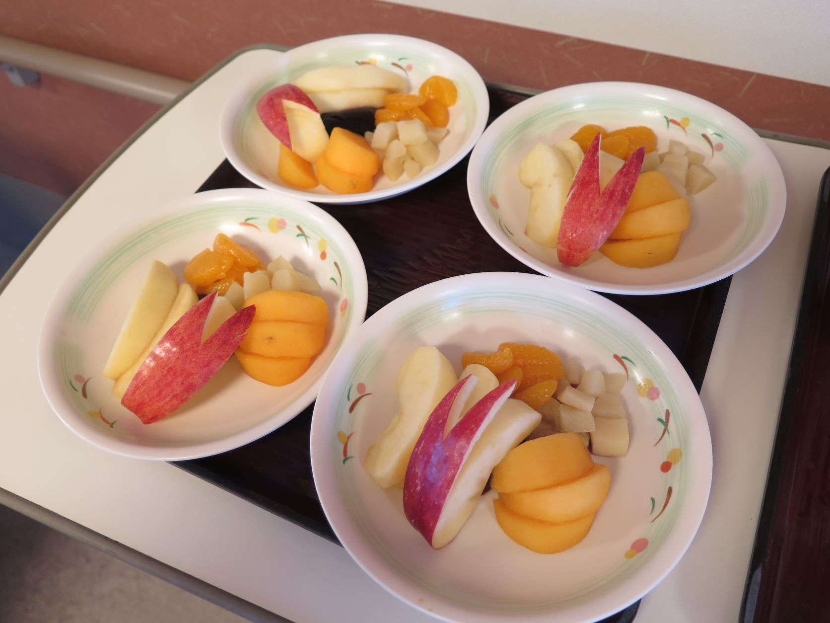色鮮やかで美味しそうに飾られた果物をみて「わぁ綺麗!」と大変喜んで頂けたようでした。職員と一緒にどれがいいか選び、和気あいあいと会話を楽しみながら召し上がって頂きました。