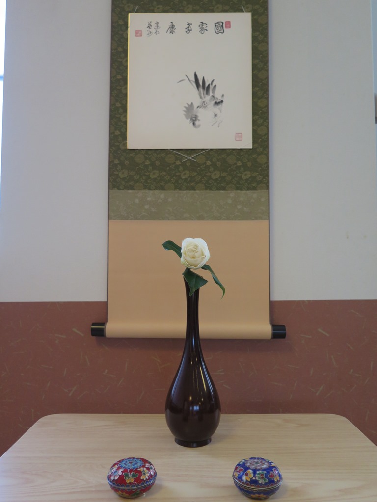 床の間には鶏の絵に「国家公康」の文字の色紙。「コケコッコー」っと読む洒落のきいたものですが、今回は「国家、国民が互いを思いやり健康であるように」と願を込めて飾りました。